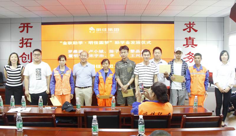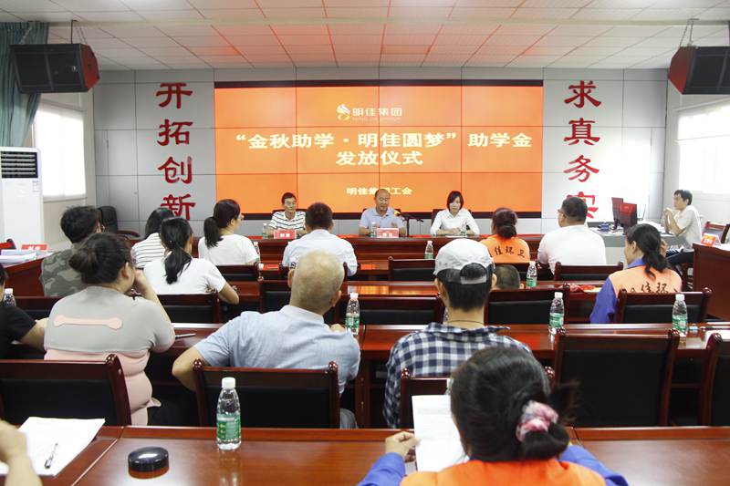 8月28日上午,明佳集團(tuán)工會(huì)“金秋助學(xué)·明佳圓夢(mèng)”助學(xué)金發(fā)放儀式在集團(tuán)公司三樓會(huì)議室舉行,為8個(gè)考取大學(xué)的職工子女發(fā)放助學(xué)金共計(jì)9600元??偛藐愒啤⒏笨偨?jīng)理鐘寒參加發(fā)放儀式,儀式由工會(huì)主席高斐斐主持。